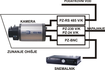 Zaščita za 230V ali 24V napajanje kamer.PZ-230 V/K in PZ-24 V/K se vgradita v notranjost zunanjega ohišja kamere, lahko pa sta tudi samostojni